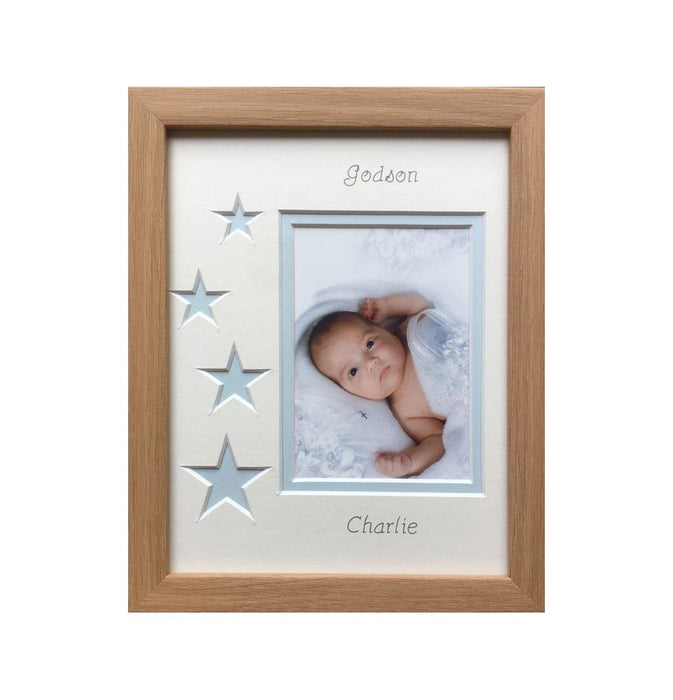 This contemporary light wood-grain picture frame is a great photo memory keepsake of a Godson, a Birthday, Baby Boy Christening, Naming or any day gift for the Godmother, Godfather and Godparents. Includes a double matted with the star shapes and an aperture to hold a size 6x4 inches in landscape or portrait.